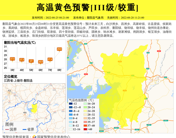 鄱阳县气象台2022年08月25日08时21分变更高温黄色预警信号:预计未来三天,白沙洲乡、昌洲乡、高家岭镇、古县渡镇、侯家岗乡、凰岗镇、枧田街乡、金盘岭镇、乐丰镇、莲湖乡、莲花山乡、芦田乡、农科所、鄱阳镇、饶埠镇、饶丰镇、饶州街道办事处、饶洲监狱、三庙前乡、石门街镇、双港镇、四十里街镇、田畈街镇、团林乡、响水滩乡、谢家滩镇、鸦鹊湖乡、银宝湖乡、油墩街镇、游城乡、柘港乡、珠湖乡的部分地区日最高气温将达35°C以上,请注意防暑降温。 信息来源:国家预警信息发布中心; 发布单位:鄱阳县气象局。