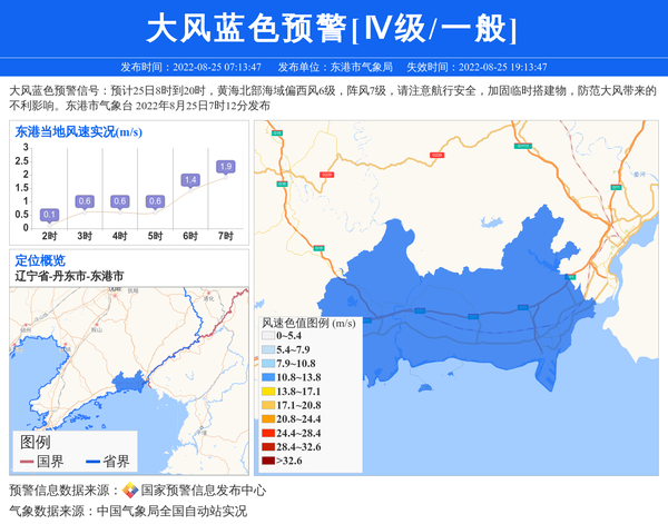 大风蓝色预警信号:预计25日8时到20时,黄海北部海域偏西风6级,阵风7级,请注意航行安全,加固临时搭建物,防范大风带来的不利影响。东港市气象台 2022年8月25日7时12分发布 信息来源:国家预警信息发布中心; 发布单位:东港市气象局。