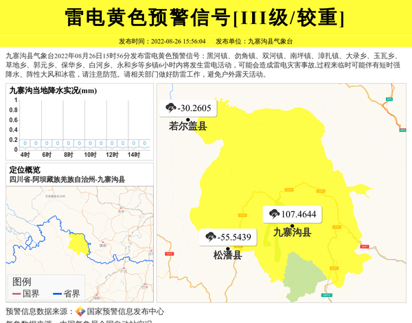 九寨沟县气象台2022年08月26日15时56分发布雷电黄色预警信号:黑河镇、勿角镇、双河镇、南坪镇、漳扎镇、大录乡、玉瓦乡、草地乡、郭元乡、保华乡、白河乡、永和乡等乡镇6小时内将发生雷电活动,可能会造成雷电灾害事故,过程来临时可能伴有短时强降水、阵性大风和冰雹,请注意防范。请相关部门做好防雷工作,避免户外露天活动。 信息来源:国家预警信息发布中心; 发布单位:九寨沟县气象台。