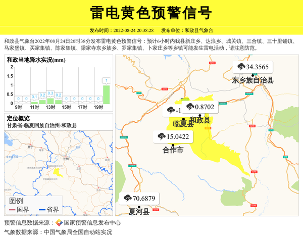 和政县气象台2022年08月24日20时38分发布雷电黄色预警信号:预计6小时内我县新庄乡、达浪乡、城关镇、三合镇、三十里铺镇、马家堡镇、买家集镇、陈家集镇、梁家寺东乡族乡、罗家集镇、卜家庄乡等乡镇可能发生雷电活动,请注意防范。 信息来源:国家预警信息发布中心; 发布单位:和政县气象台。