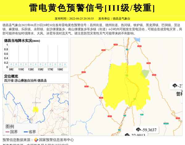 德昌县气象台2022年08月25日20时30分发布雷电黄色预警信号:昌州街道、德州街道、热河镇、铁炉镇、黑龙潭镇、巴洞镇、茨达镇、麻栗镇、乐跃镇、永郎镇、金沙傈僳族乡、南山傈僳族乡等乡镇(街道)6小时内可能发生雷电活动,可能会造成雷电灾害,局部可能伴有短时强降水、大风、冰雹等强对流天气。请注意防范灾害性天气可能带来的不利影响。 信息来源:国家预警信息发布中心; 发布单位:德昌县气象台。
