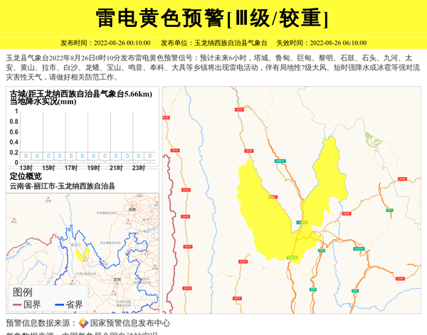 玉龙县气象台2022年8月26日0时10分发布雷电黄色预警信号:预计未来6小时,塔城、鲁甸、巨甸、黎明、石鼓、石头、九河、太安、黄山、拉市、白沙、龙蟠、宝山、鸣音、奉科、大具等乡镇将出现雷电活动,伴有局地性7级大风、短时强降水或冰雹等强对流灾害性天气,请做好相关防范工作。 信息来源:国家预警信息发布中心; 发布单位:玉龙纳西族自治县气象台。