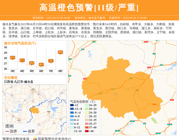 修水县气象台2022年08月25日08时20分继续发布高温橙色预警信号:预计未来24小时内,白岭镇、布甲乡、大椿乡、大桥镇、东港乡、复原乡、港口镇、古市镇、杭口镇、何市镇、黄坳乡、黄港镇、黄龙乡、黄沙镇、路口乡、马坳镇、漫江乡、庙岭乡、宁州镇、全丰镇、山口镇、上奉镇、上杭乡、上衫乡、石坳乡、水源乡、四都镇、太阳升镇、西港镇、溪口镇、新湾乡、义宁镇、余段乡、渣津镇、征村乡、竹坪乡的部分地区最高气温将达37°C以上,请注意防暑降温。 信息来源:国家预警信息发布中心; 发布单位:修水县气象局。