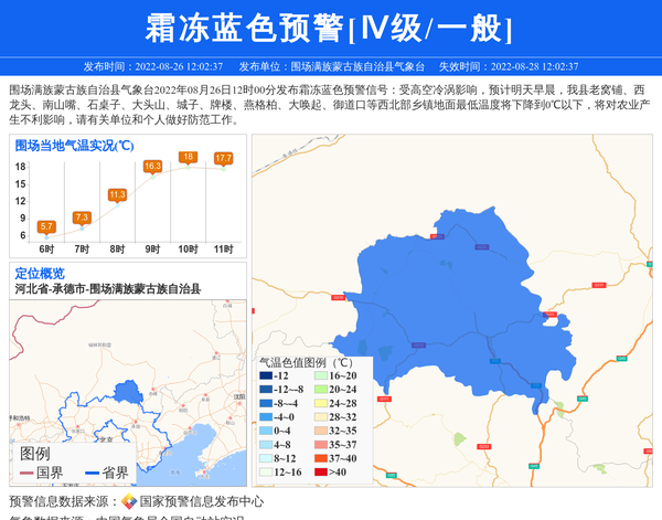 围场满族蒙古族自治县气象台2022年08月26日12时00分发布霜冻蓝色预警信号:受高空冷涡影响,预计明天早晨,我县老窝铺、西龙头、南山嘴、石桌子、大头山、城子、牌楼、燕格柏、大唤起、御道口等西北部乡镇地面最低温度将下降到0℃以下,将对农业产生不利影响,请有关单位和个人做好防范工作。 信息来源:国家预警信息发布中心; 发布单位:围场满族蒙古族自治县气象台。