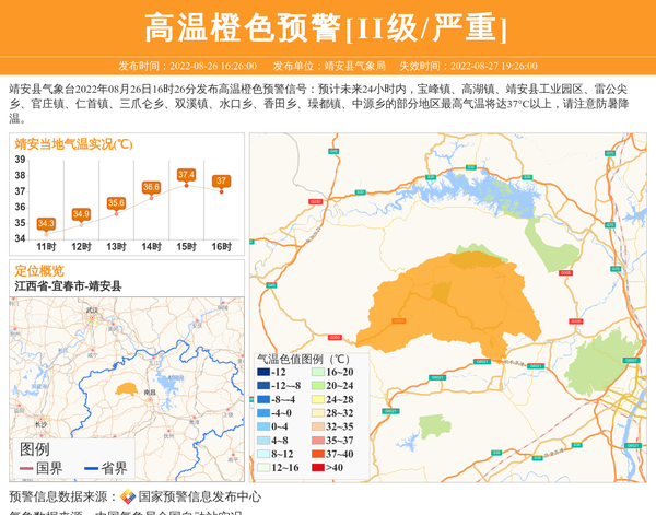 靖安县气象台2022年08月26日16时26分发布高温橙色预警信号:预计未来24小时内,宝峰镇、高湖镇、靖安县工业园区、雷公尖乡、官庄镇、仁首镇、三爪仑乡、双溪镇、水口乡、香田乡、璪都镇、中源乡的部分地区最高气温将达37°C以上,请注意防暑降温。 信息来源:国家预警信息发布中心; 发布单位:靖安县气象局。