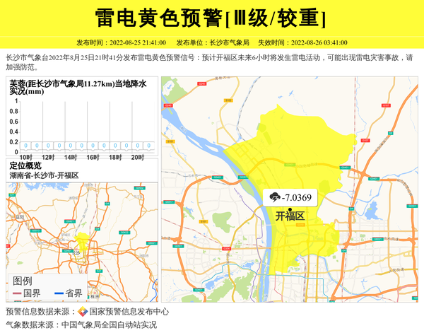 长沙市气象台2022年8月25日21时41分发布雷电黄色预警信号:预计开福区未来6小时将发生雷电活动,可能出现雷电灾害事故,请加强防范。 信息来源:国家预警信息发布中心; 发布单位:长沙市气象局。
