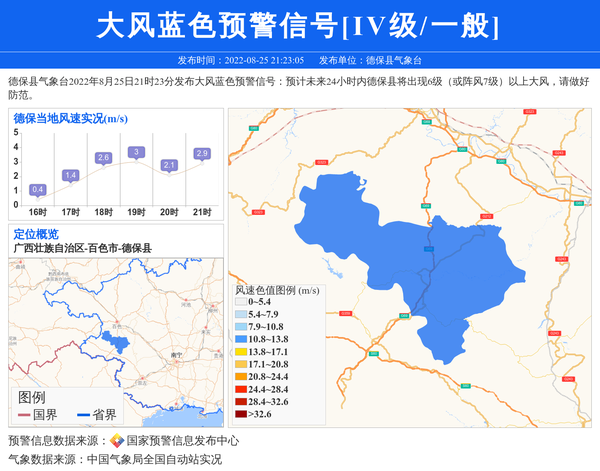 德保县气象台2022年8月25日21时23分发布大风蓝色预警信号:预计未来24小时内德保县将出现6级(或阵风7级)以上大风,请做好防范。 信息来源:国家预警信息发布中心; 发布单位:德保县气象台。