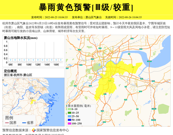 杭州市萧山区气象台2022年8月25日18时4分发布暴雨黄色预警信号:受对流云团影响,预计今天半夜前我区盈丰、宁围等城区镇(街道),南阳、益农等东部镇(街道)有阵雨或雷雨,有雷雨时可伴有短时暴雨、9~11级雷雨大风及局地小冰雹,请注意防范短时暴雨可能引发的小流域山洪、山体滑坡、城市积涝等次生灾害。 信息来源:国家预警信息发布中心; 发布单位:萧山区气象台。