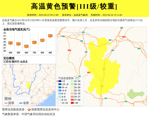 会昌县气象台2022年08月25日09时11分变更高温黄色预警信号:预计未来三天,全县所有乡镇的部分地区日最高气温将达35°C以上,请注意防暑降温。 信息来源:国家预警信息发布中心; 发布单位:会昌县气象局。