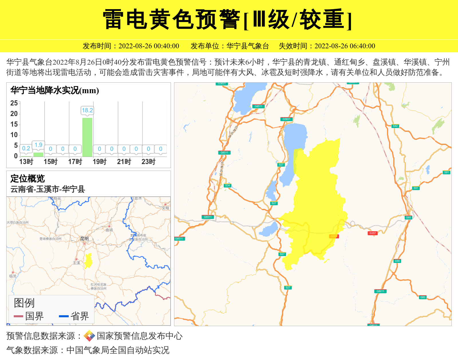 华宁县气象台2022年8月26日0时40分发布雷电黄色预警信号:预计未来6小时,华宁县的青龙镇、通红甸乡、盘溪镇、华溪镇、宁州街道等地将出现雷电活动,可能会造成雷击灾害事件,局地可能伴有大风、冰雹及短时强降水,请有关单位和人员做好防范准备。 信息来源:国家预警信息发布中心; 发布单位:华宁县气象台。