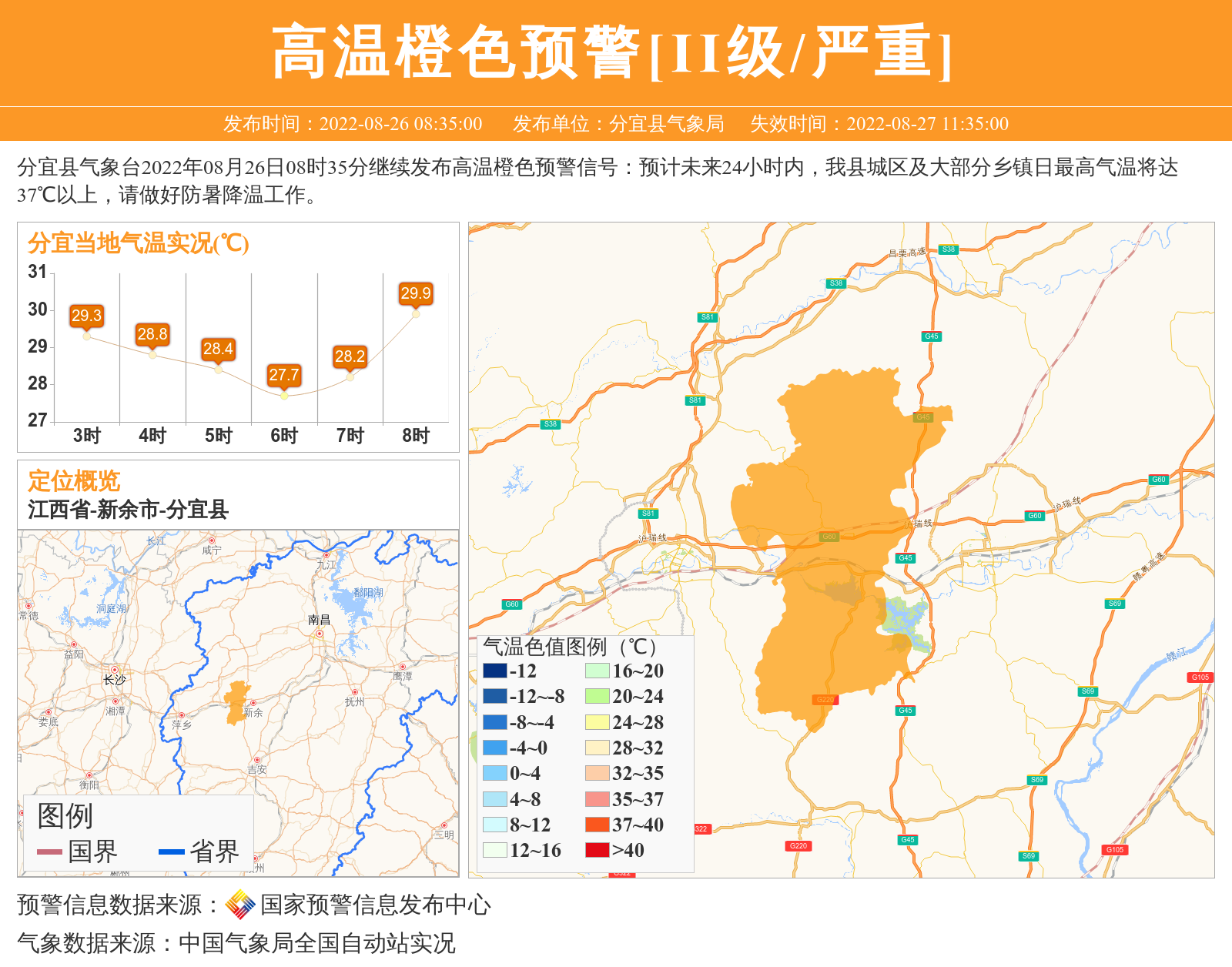 分宜县气象台2022年08月26日08时35分继续发布高温橙色预警信号:预计未来24小时内,我县城区及大部分乡镇日最高气温将达37℃以上,请做好防暑降温工作。 信息来源:国家预警信息发布中心; 发布单位:分宜县气象局。
