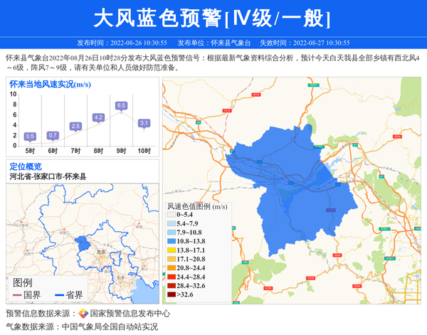 怀来县气象台2022年08月26日10时28分发布大风蓝色预警信号:根据最新气象资料综合分析,预计今天白天我县全部乡镇有西北风4~6级,阵风7~9级,请有关单位和人员做好防范准备。 信息来源:国家预警信息发布中心; 发布单位:怀来县气象台。