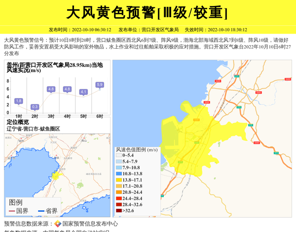 大风黄色预警信号:预计10日8时到20时,营口鲅鱼圈区西北风6到7级、阵风9级,渤海北部海域西北风7到8级、阵风10级,请做好防风工作,妥善安置易受大风影响的室外物品,水上作业和过往船舶采取积极的应对措施。营口开发区气象台2022年10月10日6时27分发布 信息来源:国家预警信息发布中心; 发布单位:营口开发区气象局。