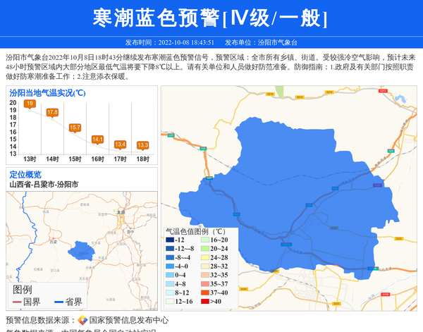 汾阳市气象台2022年10月8日18时43分继续发布寒潮蓝色预警信号,预警区域:全市所有乡镇、街道。受较强冷空气影响,预计未来48小时预警区域内大部分地区最低气温将要下降8℃以上。请有关单位和人员做好防范准备。防御指南:1.政府及有关部门按照职责做好防寒潮准备工作;2.注意添衣保暖。 信息来源:国家预警信息发布中心; 发布单位:汾阳市气象台。