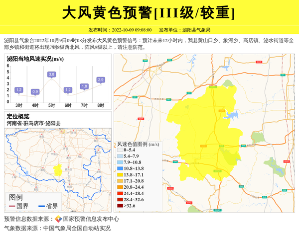 泌阳县气象台2022年10月9日09时08分发布大风黄色预警信号:预计未来12小时内,我县黄山口乡、象河乡、高店镇、泌水街道等全部乡镇和街道将出现7到8级西北风,阵风9级以上,请注意防范。 信息来源:国家预警信息发布中心; 发布单位:泌阳县气象局。