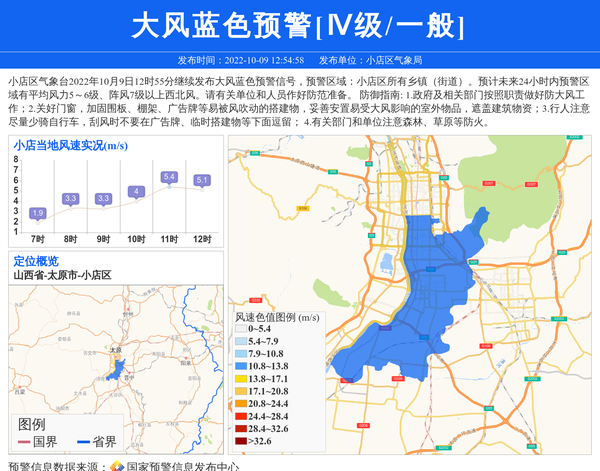 小店区气象台2022年10月9日12时55分继续发布大风蓝色预警信号,预警区域:小店区所有乡镇(街道)。预计未来24小时内预警区域有平均风力5~6级、阵风7级以上西北风。请有关单位和人员作好防范准备。 防御指南: 1.政府及相关部门按照职责做好防大风工作;2.关好门窗,加固围板、棚架、广告牌等易被风吹动的搭建物,妥善安置易受大风影响的室外物品,遮盖建筑物资;3.行人注意尽量少骑自行车,刮风时不要在广告牌、临时搭建物等下面逗留; 4.有关部门和单位注意森林、草原等防火。 信息来源:国家预警信息发布中心; 发布单位:小店区气象局。
