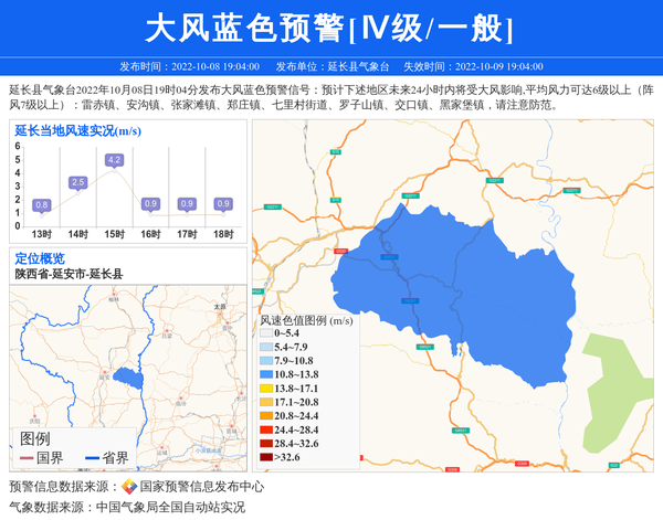 延长县气象台2022年10月08日19时04分发布大风蓝色预警信号:预计下述地区未来24小时内将受大风影响,平均风力可达6级以上(阵风7级以上):雷赤镇、安沟镇、张家滩镇、郑庄镇、七里村街道、罗子山镇、交口镇、黑家堡镇,请注意防范。 信息来源:国家预警信息发布中心; 发布单位:延长县气象台。