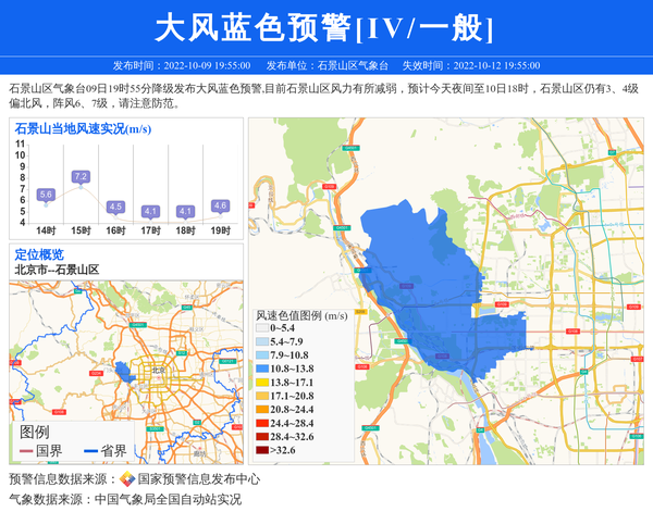 石景山区气象台09日19时55分降级发布大风蓝色预警,目前石景山区风力有所减弱,预计今天夜间至10日18时,石景山区仍有3、4级偏北风,阵风6、7级,请注意防范。 信息来源:国家预警信息发布中心; 发布单位:石景山区气象台。