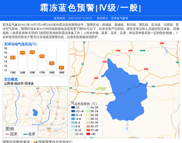 安泽县气象台2022年10月7日19时28分发布霜冻蓝色预警信号,预警区域:府城镇、唐城镇、和川镇、冀氏镇、良马镇、马壁镇。受冷空气影响,预警区域未来48小时内地面最低温度将要下降到0℃以下,对农业将产生影响。请有关单位和人员做好防范准备。 防御指南: 1.政府及农林主管部门按照职责做好防霜冻准备工作; 2.对农作物、蔬菜、花卉、瓜果、林业育种要采取一定的防护措施; 3.农村基层组织和农户要关注当地霜冻预警信息,以便采取措施加强防护。 信息来源:国家预警信息发布中心; 发布单位:安泽县气象局。