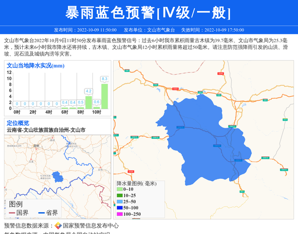 文山市气象台2022年10月9日11时50分发布暴雨蓝色预警信号:过去6小时我市累积雨量古木镇为39.7毫米、文山市气象局为25.3毫米,预计未来6小时我市降水还将持续,古木镇、文山市气象局12小时累积雨量将超过50毫米。请注意防范强降雨引发的山洪、滑坡、泥石流及城镇内涝等灾害。 信息来源:国家预警信息发布中心; 发布单位:文山市气象台。