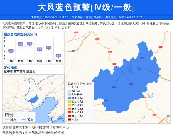 大风蓝色预警信号:预计8日20时到9日8时,建昌县偏南风转偏北风4到6级,阵风7到8级,请注意防范大风对户外作业和出行带来的不利影响。建昌县气象台2022年10月8日18时11分发布 信息来源:国家预警信息发布中心; 发布单位:建昌县气象局。