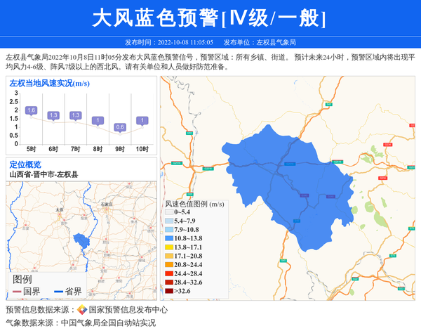 左权县气象局2022年10月8日11时05分发布大风蓝色预警信号,预警区域:所有乡镇、街道。 预计未来24小时,预警区域内将出现平均风力4-6级、阵风7级以上的西北风。请有关单位和人员做好防范准备。 信息来源:国家预警信息发布中心; 发布单位:左权县气象局。