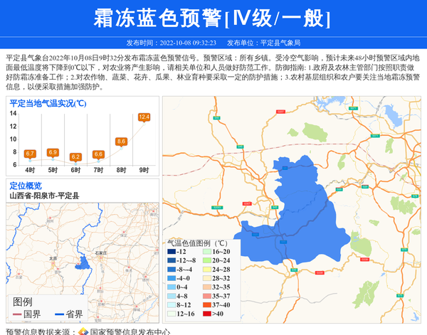 平定县气象台2022年10月08日9时32分发布霜冻蓝色预警信号。预警区域:所有乡镇。受冷空气影响,预计未来48小时预警区域内地面最低温度将下降到0℃以下,对农业将产生影响,请相关单位和人员做好防范工作。防御指南: 1.政府及农林主管部门按照职责做好防霜冻准备工作;2.对农作物、蔬菜、花卉、瓜果、林业育种要采取一定的防护措施;3.农村基层组织和农户要关注当地霜冻预警信息,以便采取措施加强防护。 信息来源:国家预警信息发布中心; 发布单位:平定县气象局。