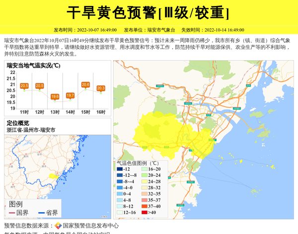 瑞安市气象台2022年10月07日16时49分继续发布干旱黄色预警信号:预计未来一周降雨仍稀少,我市所有乡(镇、街道)综合气象干旱指数将达重旱到特旱,请继续做好水资源管理、用水调度和节水等工作,防范持续干旱对能源保供、农业生产等的不利影响,并特别注意防范森林火灾的发生。 信息来源:国家预警信息发布中心; 发布单位:瑞安市气象台。