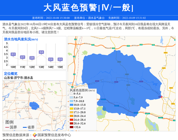 泗水县气象台2022年10月08日15时30分发布大风蓝色预警信号:受较强冷空气影响,预计今天夜间到10日我县将出现大风降温天气。今天夜间到9日,北风5~6级阵风7~8级。过程降温幅度6~8℃,11日最低气温5℃左右,局部2℃,有霜冻或轻霜冻。另外,今天夜间我县部分地区有小雨。请注意防范! 信息来源:国家预警信息发布中心; 发布单位:泗水县气象台。