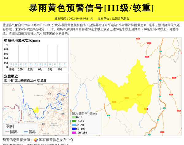 盐源县气象台2022年10月09日05时11分发布暴雨黄色预警信号:盐源县树河东平电站3小时累计降雨量达31.1毫米,预计降雨天气还将持续,未来6小时盐源县树河、田湾、右所等乡镇降雨量将达50毫米以上或者已达50毫米以上且降雨(10毫米/小时以上)可能持续。请注意防范灾害性天气可能带来的不利影响。 信息来源:国家预警信息发布中心; 发布单位:盐源县气象台。