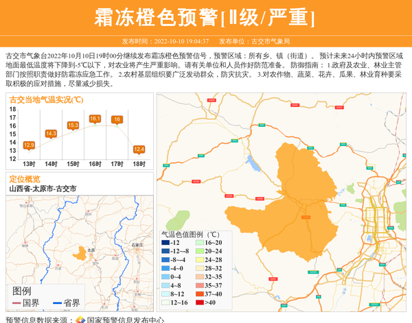 古交市气象台2022年10月10日19时00分继续发布霜冻橙色预警信号,预警区域:所有乡、镇(街道)。 预计未来24小时内预警区域地面最低温度将下降到-5℃以下,对农业将产生严重影响。请有关单位和人员作好防范准备。 防御指南: 1.政府及农业、林业主管部门按照职责做好防霜冻应急工作。 2.农村基层组织要广泛发动群众,防灾抗灾。 3.对农作物、蔬菜、花卉、瓜果、林业育种要采取积极的应对措施,尽量减少损失。 信息来源:国家预警信息发布中心; 发布单位:古交市气象局。
