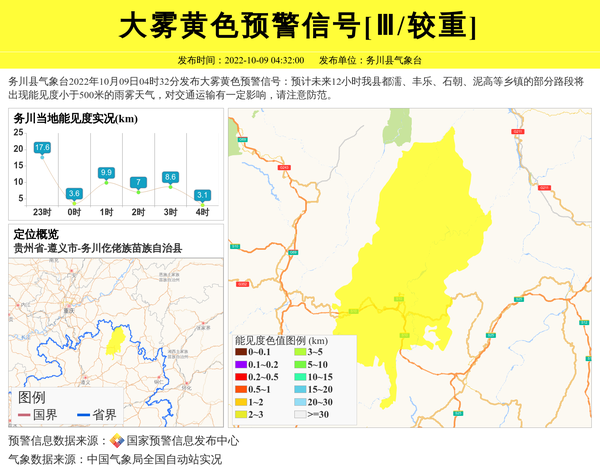 务川县气象台2022年10月09日04时32分发布大雾黄色预警信号:预计未来12小时我县都濡、丰乐、石朝、泥高等乡镇的部分路段将出现能见度小于500米的雨雾天气,对交通运输有一定影响,请注意防范。 信息来源:国家预警信息发布中心; 发布单位:务川县气象台。