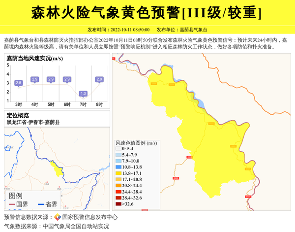 嘉荫县气象台和县森林防灭火指挥部办公室2022年10月11日08时50分联合发布森林火险气象黄色预警信号:预计未来24小时内,嘉荫境内森林火险等级高,请有关单位和人员立即按照“预警响应机制”进入相应森林防火工作状态,做好各项防范和扑火准备。 信息来源:国家预警信息发布中心; 发布单位:嘉荫县气象台。