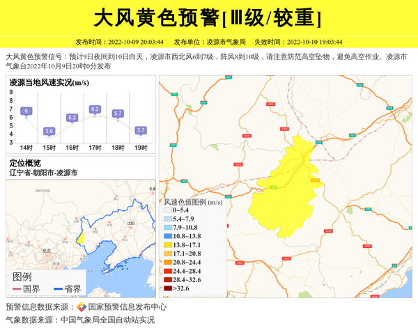 大风黄色预警信号:预计9日夜间到10日白天,凌源市西北风6到7级,阵风8到10级,请注意防范高空坠物,避免高空作业。凌源市气象台2022年10月9日20时0分发布 信息来源:国家预警信息发布中心; 发布单位:凌源市气象局。