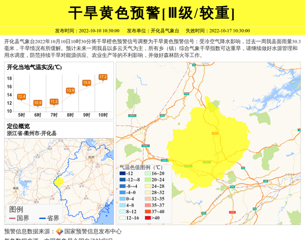 开化县气象台2022年10月10日10时30分将干旱橙色预警信号调整为干旱黄色预警信号:受冷空气降水影响,过去一周我县面雨量30.3毫米,干旱情况有所缓解。预计未来一周我县以多云天气为主,所有乡(镇)综合气象干旱指数可达重旱,请继续做好水源管理和用水调度,防范持续干旱对能源供应、农业生产等的不利影响,并做好森林防火等工作。 信息来源:国家预警信息发布中心; 发布单位:开化县气象台。