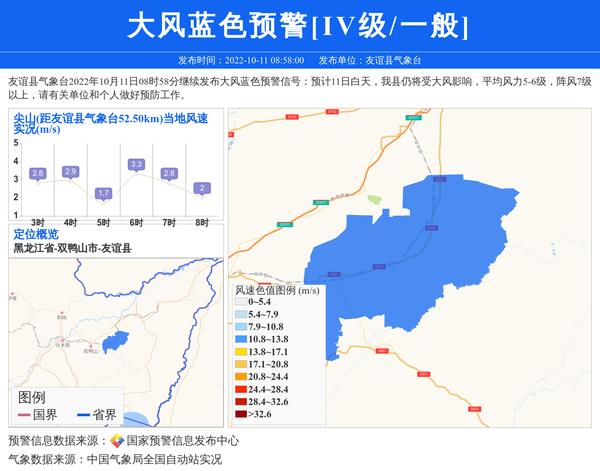友谊县气象台2022年10月11日08时58分继续发布大风蓝色预警信号:预计11日白天,我县仍将受大风影响,平均风力5-6级,阵风7级以上,请有关单位和个人做好预防工作。 信息来源:国家预警信息发布中心; 发布单位:友谊县气象台。