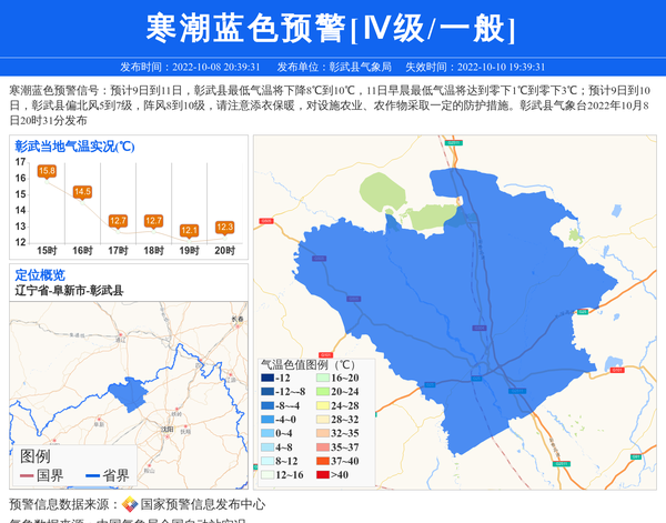 寒潮蓝色预警信号:预计9日到11日,彰武县最低气温将下降8℃到10℃,11日早晨最低气温将达到零下1℃到零下3℃;预计9日到10日,彰武县偏北风5到7级,阵风8到10级,请注意添衣保暖,对设施农业、农作物采取一定的防护措施。彰武县气象台2022年10月8日20时31分发布 信息来源:国家预警信息发布中心; 发布单位:彰武县气象局。