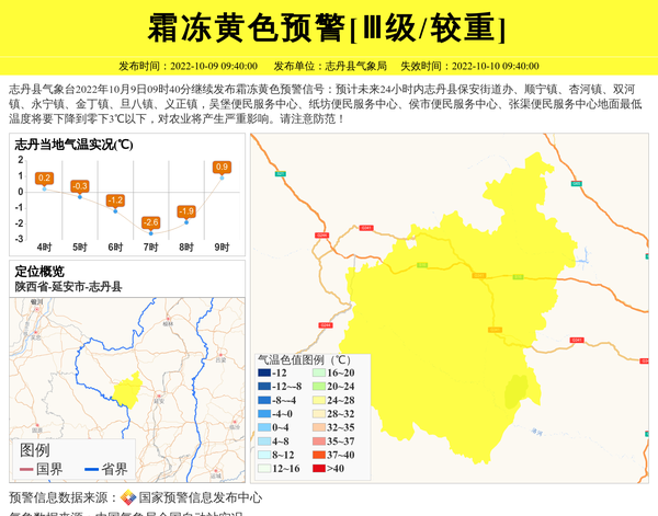 志丹县气象台2022年10月9日09时40分继续发布霜冻黄色预警信号:预计未来24小时内志丹县保安街道办、顺宁镇、杏河镇、双河镇、永宁镇、金丁镇、旦八镇、义正镇,吴堡便民服务中心、纸坊便民服务中心、侯市便民服务中心、张渠便民服务中心地面最低温度将要下降到零下3℃以下,对农业将产生严重影响。请注意防范! 信息来源:国家预警信息发布中心; 发布单位:志丹县气象局。