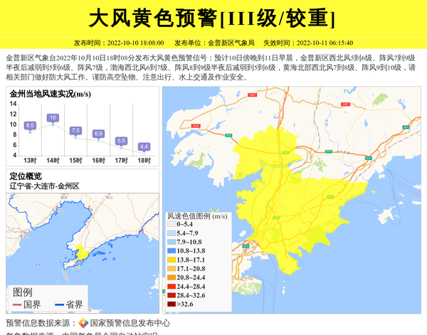金普新区气象台2022年10月10日18时08分发布大风黄色预警信号:预计10日傍晚到11日早晨,金普新区西北风5到6级、阵风7到9级半夜后减弱到5到6级、阵风7级,渤海西北风6到7级、阵风8到9级半夜后减弱到5到6级,黄海北部西北风7到8级、阵风9到10级,请相关部门做好防大风工作。谨防高空坠物、注意出行、水上交通及作业安全。 信息来源:国家预警信息发布中心; 发布单位:金普新区气象局。