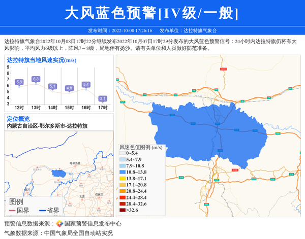 达拉特旗气象台2022年10月08日17时22分继续发布2022年10月07日17时29分发布的大风蓝色预警信号:24小时内达拉特旗仍将有大风影响,平均风力6级以上,阵风7~8级,局地伴有扬沙。请有关单位和人员做好防范准备。 信息来源:国家预警信息发布中心; 发布单位:达拉特旗气象台。