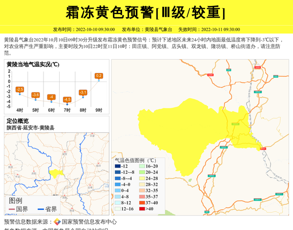 黄陵县气象台2022年10月10日09时30分升级发布霜冻黄色预警信号:预计下述地区未来24小时内地面最低温度将下降到-3℃以下,对农业将产生严重影响,主要时段为10日22时至11日10时:田庄镇、阿党镇、店头镇、双龙镇、隆坊镇、桥山街道办,请注意防范。 信息来源:国家预警信息发布中心; 发布单位:黄陵县气象台。
