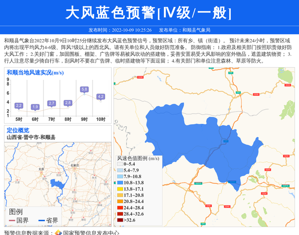 和顺县气象台2022年10月9日10时25分继续发布大风蓝色预警信号,预警区域:所有乡、镇(街道)。 预计未来24小时,预警区域内将出现平均风力4-6级、阵风7级以上的西北风。请有关单位和人员做好防范准备。 防御指南: 1.政府及相关部门按照职责做好防大风工作; 2.关好门窗,加固围板、棚架、广告牌等易被风吹动的搭建物,妥善安置易受大风影响的室外物品,遮盖建筑物资; 3.行人注意尽量少骑自行车,刮风时不要在广告牌、临时搭建物等下面逗留; 4.有关部门和单位注意森林、草原等防火。 信息来源:国家预警信息发布中心; 发布单位:和顺县气象局。