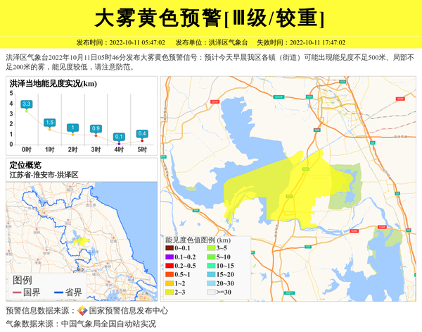 洪泽区气象台2022年10月11日05时46分发布大雾黄色预警信号:预计今天早晨我区各镇(街道)可能出现能见度不足500米、局部不足200米的雾,能见度较低,请注意防范。 信息来源:国家预警信息发布中心; 发布单位:洪泽区气象台。
