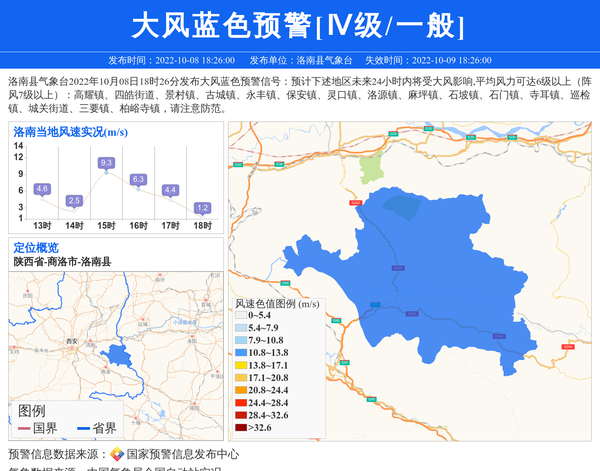 洛南县气象台2022年10月08日18时26分发布大风蓝色预警信号:预计下述地区未来24小时内将受大风影响,平均风力可达6级以上(阵风7级以上):高耀镇、四皓街道、景村镇、古城镇、永丰镇、保安镇、灵口镇、洛源镇、麻坪镇、石坡镇、石门镇、寺耳镇、巡检镇、城关街道、三要镇、柏峪寺镇,请注意防范。 信息来源:国家预警信息发布中心; 发布单位:洛南县气象台。