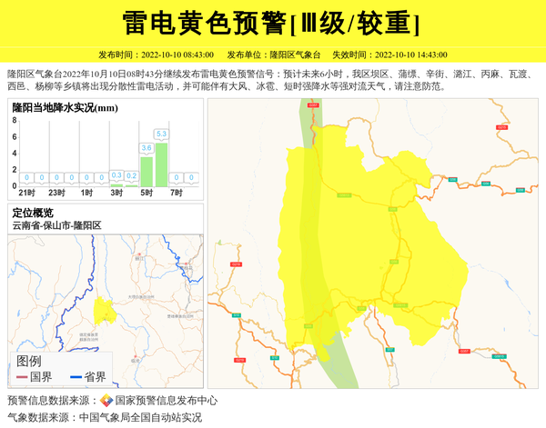 隆阳区气象台2022年10月10日08时43分继续发布雷电黄色预警信号:预计未来6小时,我区坝区、蒲缥、辛街、潞江、丙麻、瓦渡、西邑、杨柳等乡镇将出现分散性雷电活动,并可能伴有大风、冰雹、短时强降水等强对流天气,请注意防范。 信息来源:国家预警信息发布中心; 发布单位:隆阳区气象台。