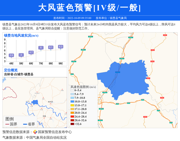镇赉县气象台2022年10月9日9时35分发布大风蓝色预警信号:预计未来24小时内我县风力较大,平均风力可达6级以上,阵风可达8级以上,县应急管理局、县气象局联合提醒:注意做好防范工作。 信息来源:国家预警信息发布中心; 发布单位:镇赉县气象局。