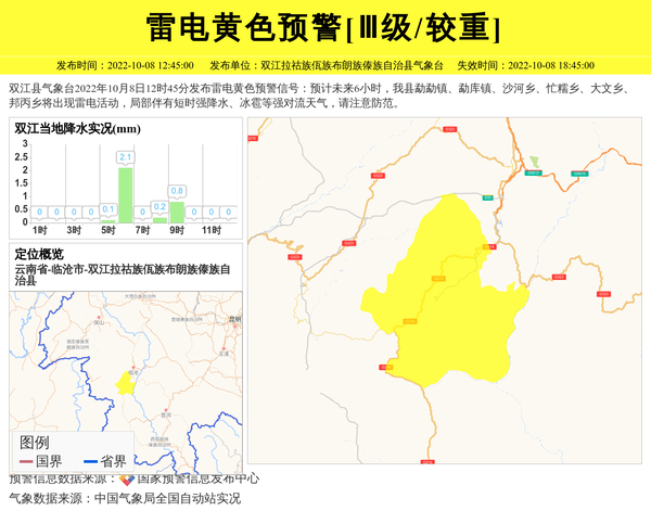 双江县气象台2022年10月8日12时45分发布雷电黄色预警信号:预计未来6小时,我县勐勐镇、勐库镇、沙河乡、忙糯乡、大文乡、邦丙乡将出现雷电活动,局部伴有短时强降水、冰雹等强对流天气,请注意防范。 信息来源:国家预警信息发布中心; 发布单位:双江拉祜族佤族布朗族傣族自治县气象台。