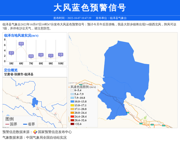 临泽县气象台2022年10月07日10时47分发布大风蓝色预警信号:预计今天午后至傍晚,我县大部乡镇将出现5-6级西北风,阵风可达7级,并伴有沙尘天气,请注意防范。 信息来源:国家预警信息发布中心; 发布单位:临泽县气象台。