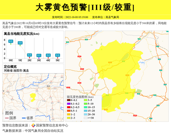 嵩县气象台2022年10月8日05时19分发布大雾黄色预警信号:预计未来12小时内我县所有乡镇将出现能见度小于500米的雾,局地能见度小于200米,可能或已经对交通等造成较大影响。 信息来源:国家预警信息发布中心; 发布单位:嵩县气象局。