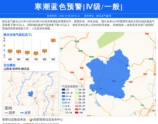 静乐县气象台2022年10月8日9时30分发布寒潮蓝色预警信号,预警区域:所有乡镇。 预计未来48小时预警区域内大部分地区最低气温将要下降8℃以上,局部地区最低气温将要下降10℃以上。请有关单位和人员作好防范准备。 防御指南: 1.政府及有关部门按照职责做好防寒潮准备工作; 2.注意添衣保暖。 信息来源:国家预警信息发布中心; 发布单位:静乐县气象局。